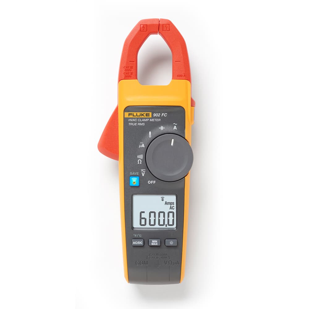 La pinza amperométrica para sistemas de climatización Fluke 902 FC de valor eficaz verdadero es un multímetro inalámbrico compatible con Fluke Connect™ que mejora la productividad de los técnicos de sistemas de climatización en terreno. El multímetro resistente con calificación doble (CAT III, 600/CAT IV, 300 V) realiza las mediciones esenciales de los sistemas de climatización, como los microamperios para realizar pruebas de sensores de luz piloto, la resistencia de hasta 60 kilohmios, la corriente CA, el voltaje de CA/CC, la capacitancia y la temperatura de contacto, a la vez que elimina la necesidad de usar varias herramientas. Su estructura pequeña es fácil de sujetar y la mordaza encaja perfectamente en espacios de trabajo reducidos.